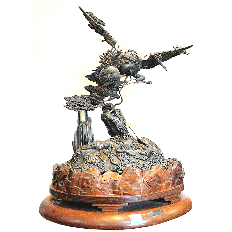 本品是中國傳統(tǒng)金屬鍛鏨技藝第二代傳人、工藝美術(shù)大師康文昇的絕世之作,同時參與制作的還有我單位多位高級技師。曾經(jīng)榮獲中國輕工部工藝美術(shù)品百花獎優(yōu)秀新產(chǎn)品二等獎。