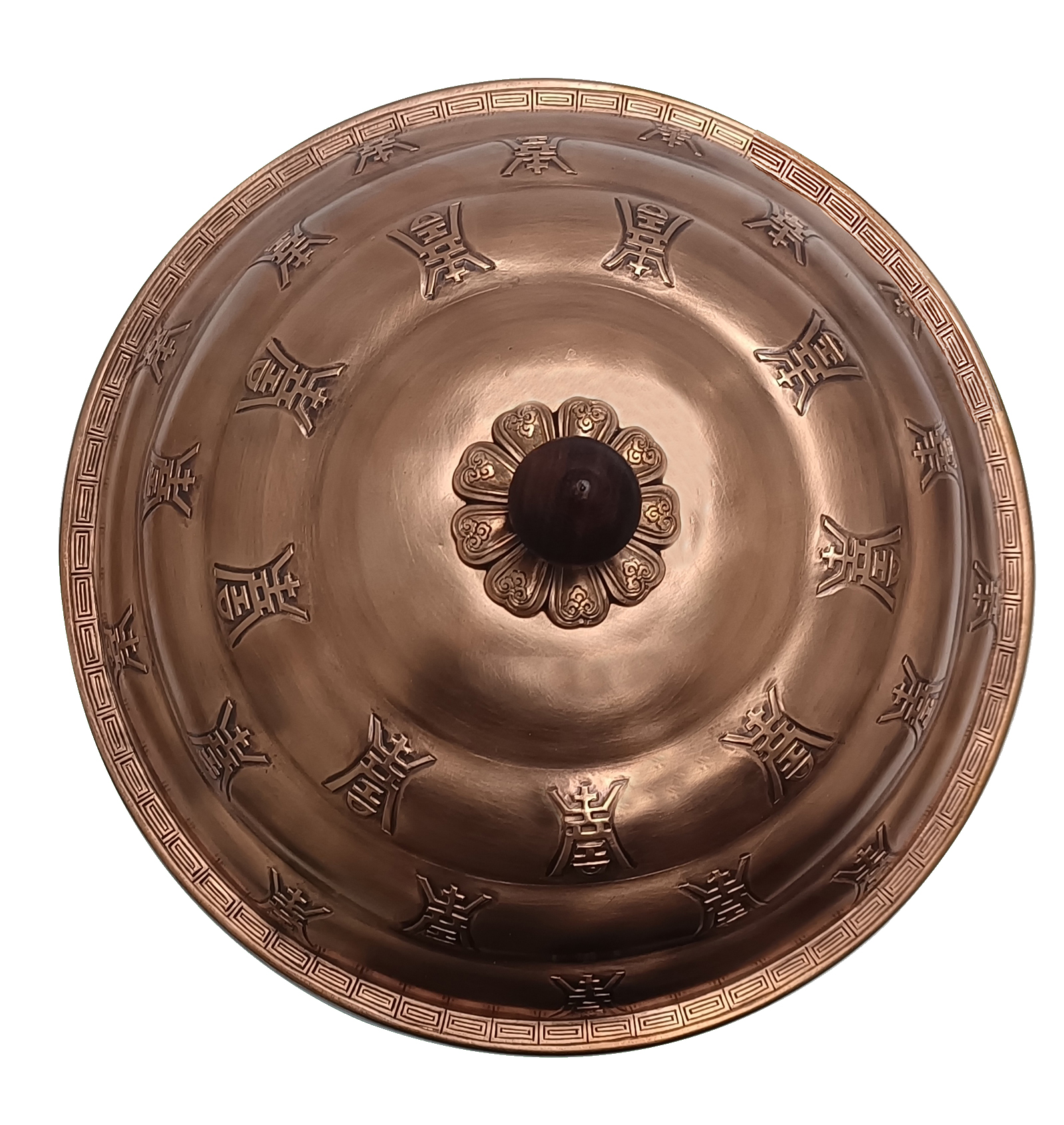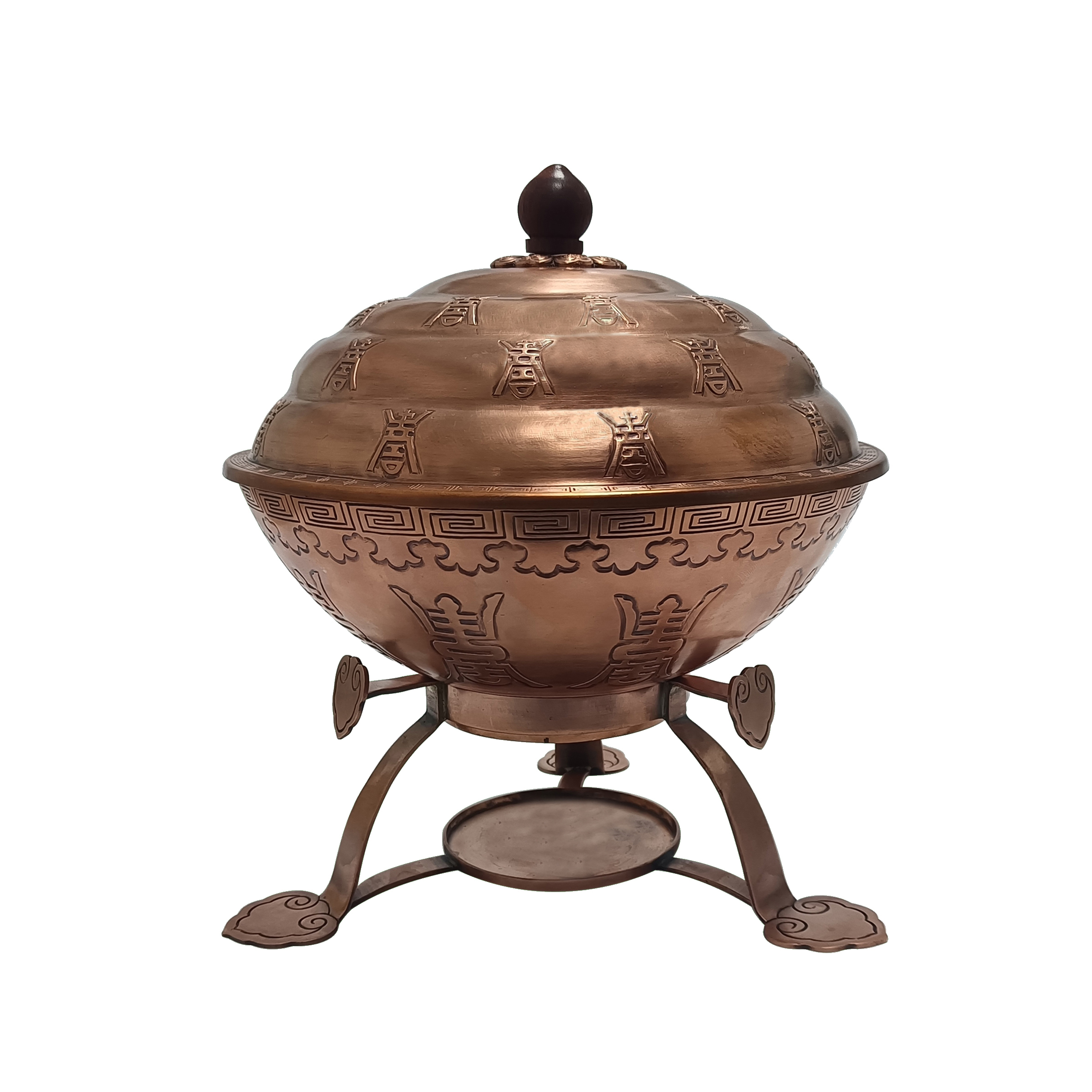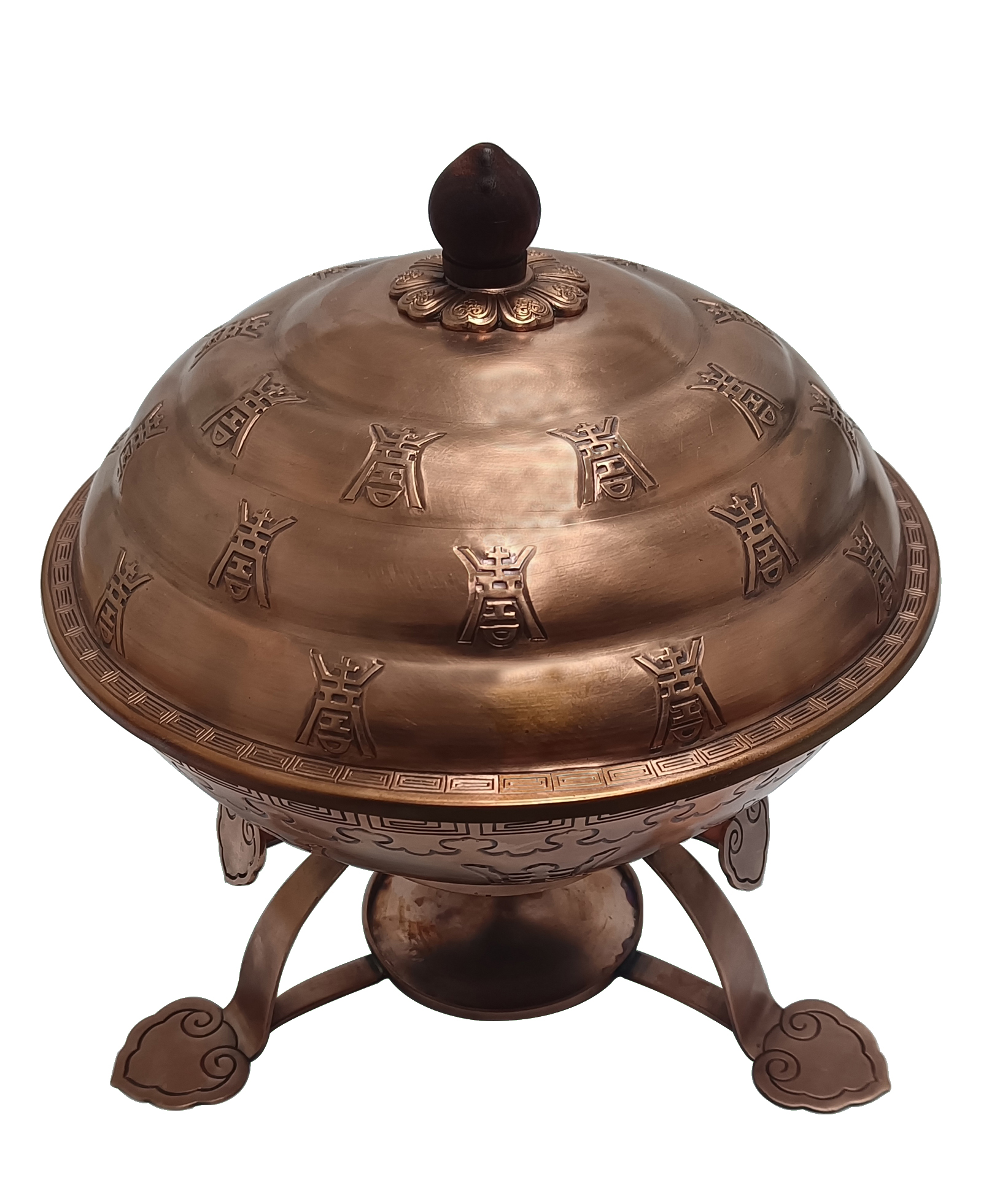 我公司設計制作的壽字暖鍋由鍋蓋、鍋身、三足如意托三部分構成。壽字暖鍋形制源于宮廷,器形華麗,鍋身為紫銅打造。現代研究表明,人體攝入適量銅元素,能促進骨骼、內臟及神經系統發育;促進細胞生成,預防貧血。暖鍋通體以非遺技藝金屬鍛鏨制作而成,鏨有壽字紋、回字紋、如意紋,寓意富貴長春、福壽延綿。