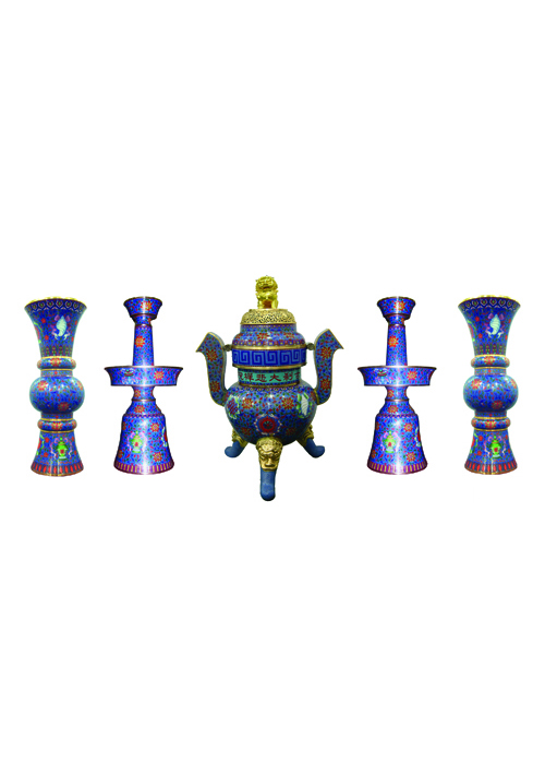 陳設于三世佛前,琺瑯制品。中間是八卦香爐,兩側是燭臺和花瓶,供燒香、明燈及獻花之用。