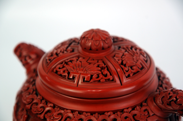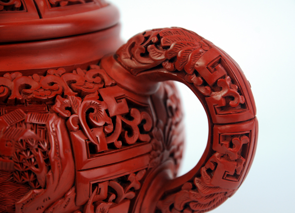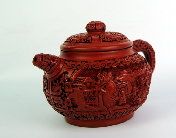 外表為漆,內部為砂,兩種材質、兩種工藝相結合,既可沖茶泡茶又可把玩欣賞。表面紋飾為風景圖案,設計精美,刀法精湛。
