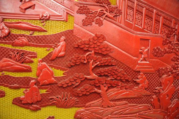 屏風器形較大,采用黃底剔紅工藝。曲水流觴,是中國古代民間的一種傳統習俗,一是歡慶和娛樂,二是祈福免災。后來發展成為文人墨客詩酒唱酬的一種雅事。