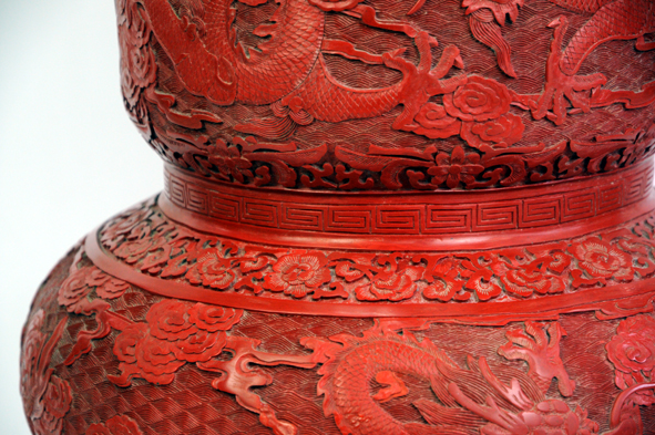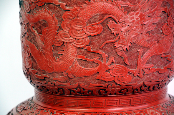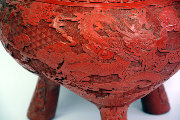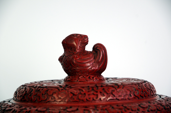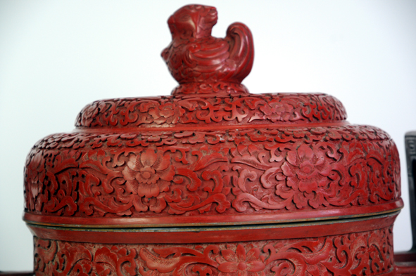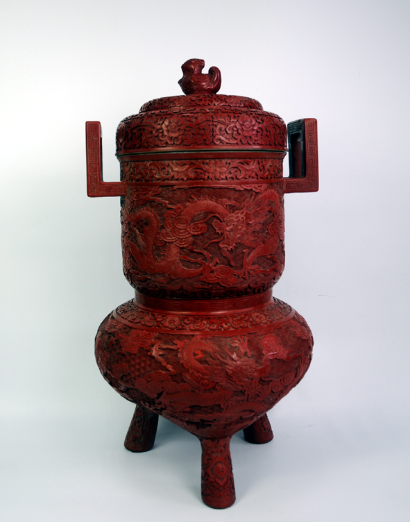 此器為仿西周中期青銅器孚公甗的造型并有所改動(dòng),甗原為蒸食用具,后來(lái)演變成古代貴族財(cái)富、地位、權(quán)利的象征。(北京雕漆工廠上世紀(jì)八十年代作品)