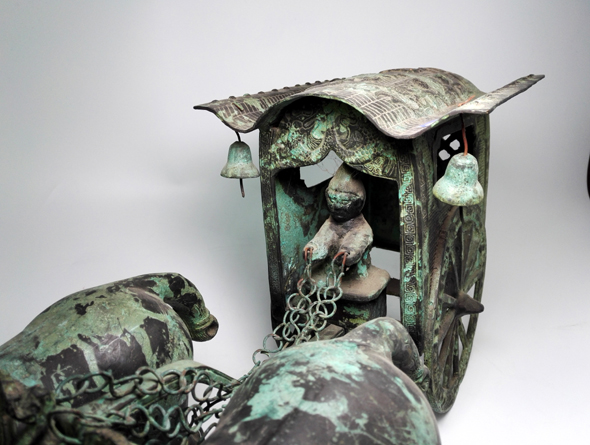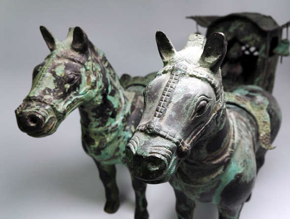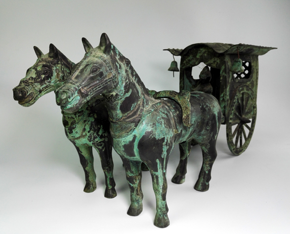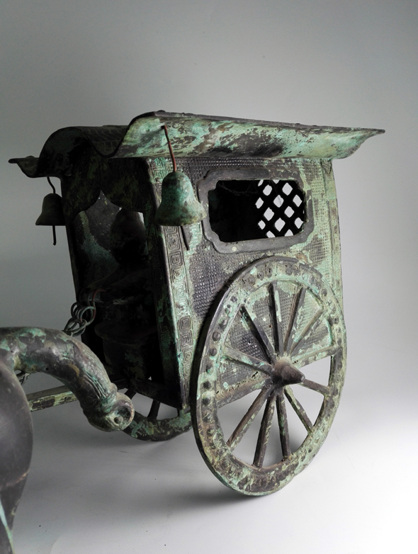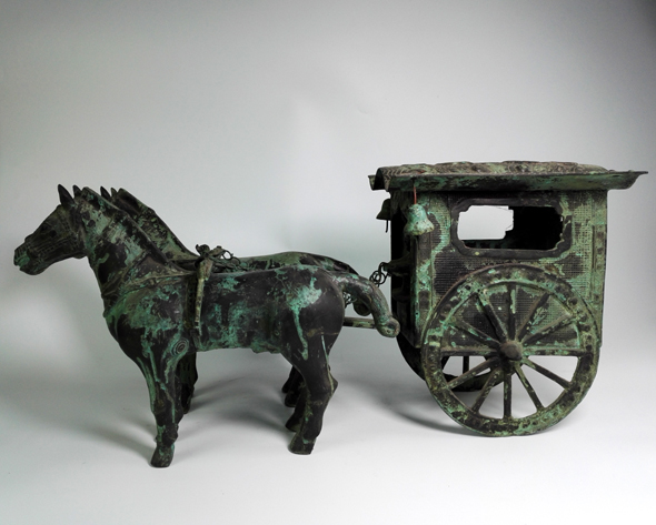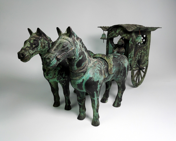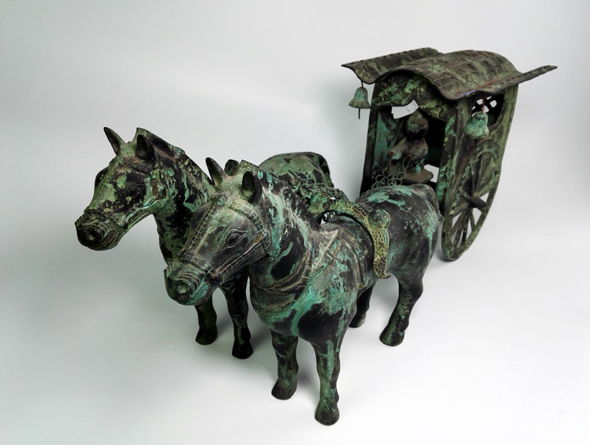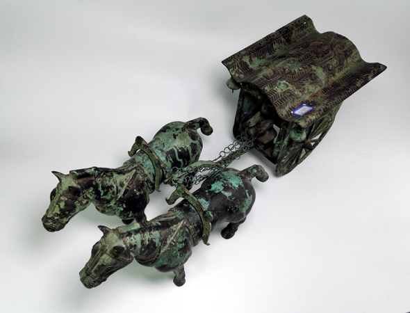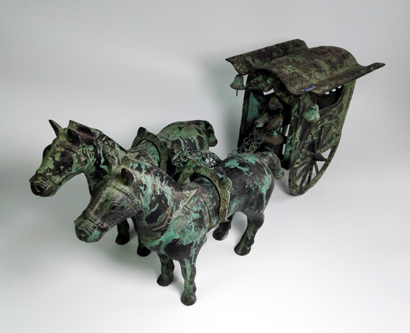 銅車馬是秦始皇陵的大型陪葬銅車馬模型,1980年出土于中國陜西臨潼秦始皇陵墳丘西側。共兩乘,一前一后排列。經復原,大小約為真人真馬的二分之一。制作年代約在陵墓興建時期,即公元前221~前210年間。(此件產品為我公司制作的仿制品)